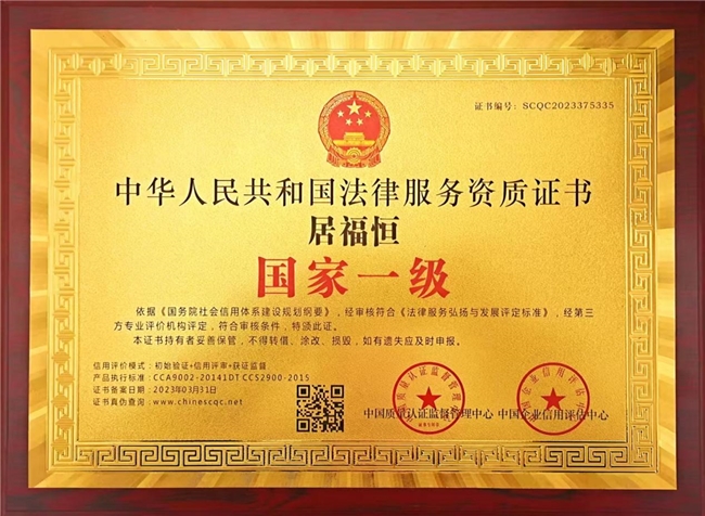 从业以来,居福恒获得了诸多荣誉:“影响中国百强大律师”、“优秀民商律师”、“世界杰出华人”、“共和国精英”、“激荡百年·领航中国优秀共产党人”、“新时代行业先锋人物”、“中国律师杰出贡献人物”、“中国律师行业十大著名律师”、“首届人类文明贡献奖金奖”、“国家首席律师”等。这些称号,是社会各界对其专业贡献与社会影响的认可。